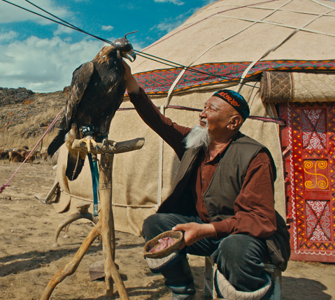 二是以“诗”写“史”,追求民族心灵史的诗意表达。写“史”的电影往往容易失之于“大”、失之于“糙”、失之于“硬”,而《远去的牧歌》却把“史”交给了“诗”,举重若轻、以小见大,向着人类精神世界的最深处探寻,善于在幽微处发现美善,将历史浸润到饱满的细节中、融化到真诚的诗意中、流淌在浓郁的真情中、生动在散文化的结构中,实现了“诗”与“史”、“史”与“诗”的辩证统一和有机融合。从结构上说,影片没有一个一以贯之的叙事蓝本,而是选取1980年代中期的一个冬天、1990年代中期的一个春天、2000年代中期的一个夏天和2010年代中期的一个秋天来支撑叙事,四个不同年代的季节富于深刻的象征意味,宛如这首“远去的牧歌”的四个乐章,这四个乐章虽然有着不同的音色,但却保持着连贯的历史线索和情感线索,从而使得影片形散却神不散;从细节和诗意上说,比如,开场罕见的暴风雪,哈山的遇难隐喻了传统游牧文化即将受到巨大的冲击和挑战,而暴风雪中降生的博兰古丽,这个名字的意思为“风雪之花”,则隐喻了她将是游牧文化的新生力量和希望,这为后来博兰古丽考上大学、回乡建设牧民新村埋下伏笔;胡玛尔对猎枪的告别、对老马的告别、对鹰的告别、对转场过程中坠崖的儿子的告别,隐喻了对一种生产方式和生活方式的告别,特别是河边胡玛尔与即将离世的老马的相拥而泣、猎鹰任胡玛尔无论怎么饿它也不飞走最后不得不飞走时在帐篷上空久久盘旋的场景,既深刻表达了“牧歌正在远去”的主题,又具有强大的情感力量,可谓撼人心魄;转场时哈迪夏家毡房房顶那一窝燕子被移到拴马桩上,哈迪夏对燕子说“我要走了,请原谅我”,孩子们对燕子深情回眸,隐喻了对人与自然和谐相处的赞颂和渴念。从画面经营上说,既展示新疆令人惊叹不已的大美山川,也在这样的画面中注入灵魂。比如,胡玛尔儿子坠崖的那次转场,那在近乎没有道路可走的陡峭的山上艰难而又坚定地攀爬的长长的队伍,那漫山峻峭的岩石,诗意而又深刻地展现了转场的艰辛,呈现出一种极富质感的美。开场巨大的暴风雪,也不仅仅是自然景象的再现,而是对传统游牧文化将要受到的巨大冲击的诗性隐喻。
