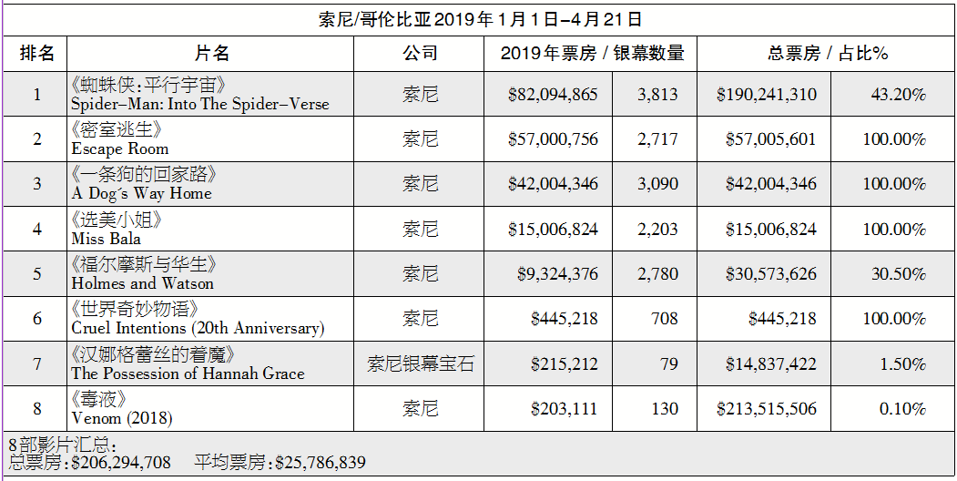 截至4月21日,索尼影业2019年利润增加至4.89亿美元。《精灵旅社3:疯狂假期》(Hotel Transylvania 3: Summer Vacation,票房5.29亿美元)、《毒液》(Venom,票房8.55亿美元)和《蜘蛛侠:平行宇宙》(Spider-Man: Into the Spider-Verse,票房3.74亿美元)这些影片对票房起到了推动作用。