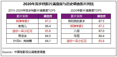具体来看,位于档期满意度前两位的《拆弹专家2》和《送你一朵小红花》,均进入2020年单片满意度和历史调查贺岁档影片的前五位;同时,两部影片分别居历史调查312部影片满意度的第7、第16位。