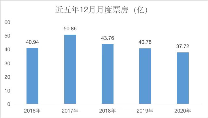 2020年12月票房相比10月票房有所回落,但从整体的影片质量和票房收入来说,都为2020年中国电影年度总票房突破200亿作出了应有的贡献。12月总票房37.72亿,对比近五年12月票房来看为最低值,但是12月票房体量较11月增长超一倍,贺岁档、元旦档优势显著,高质量、好口碑影片的发酵让市场逐渐回暖。