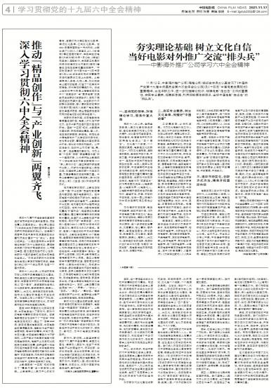 11月12日,中影海外推广公司(海推公司)组织全体员工认真学习了《中国共产党第十九届中央委员会第六次...