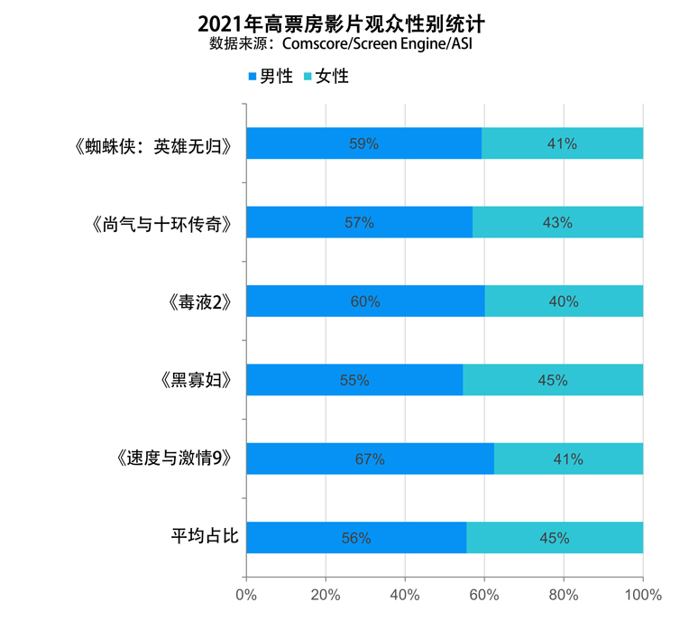 2021年前五名的影片吸引了大量的男性观众,《速度与激情9》(男性观众占比67%)、《毒液2》(男性观众占比60%)、《蜘蛛侠:英雄无归》(男性观众占比(59%)和《尚气与十环传奇》(男性观众占比57%)吸引了较平均占比(56%)要高的男性观众观看。