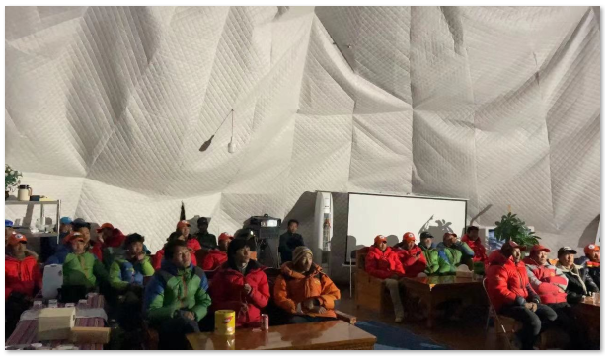 在夕阳西下,晚风徐徐的时刻,许多人聚集在大银幕前,聊电影、聊家常,珠峰的夜晚有声有色。这场活动使用了一块幕布和一个投影仪,把充满正能量的爱国影片《战狼》送到登山者和游客们的身边。电影的精彩情节和优质画面让大家尽情享受观影的乐趣。观众们纷纷表示,在世界最高峰珠穆朗玛峰脚下能欣赏电影,是终身难忘的体验。这不仅是一次难忘的旅行经历,更是一次难得的文化体验,让人感受到文化的自信和力量。