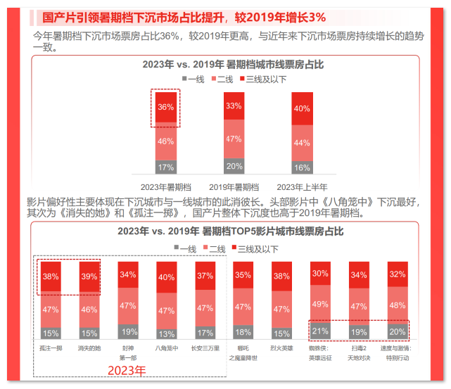 《报告》显示,2023年暑期档更具韧劲。与2019年暑期档相比,2023年暑期档期间,大盘工作日日均票房同比2019年增长27%,最高涨幅达到43.3%,周末增长10%以上。