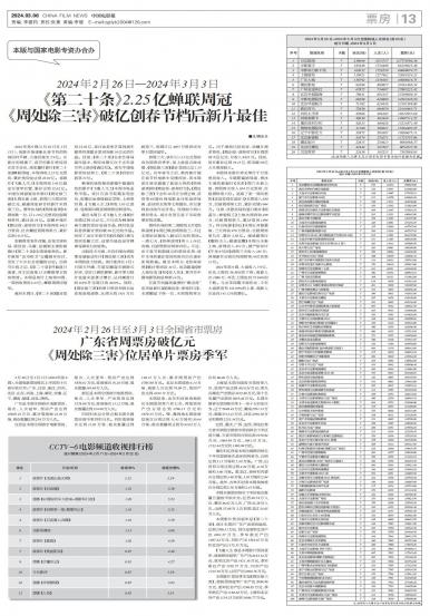 2月26日至3月3日(2024年第9周),全国电影票房排名上半区的十五省市依次为:广东、江苏、浙江、...