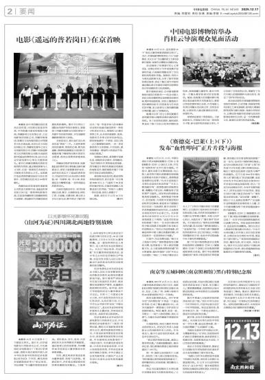 本报讯 12月13日是第十二个国家公祭日。连日来,由华夏电影发行有限责任公司、中央新闻纪录电影制片厂...